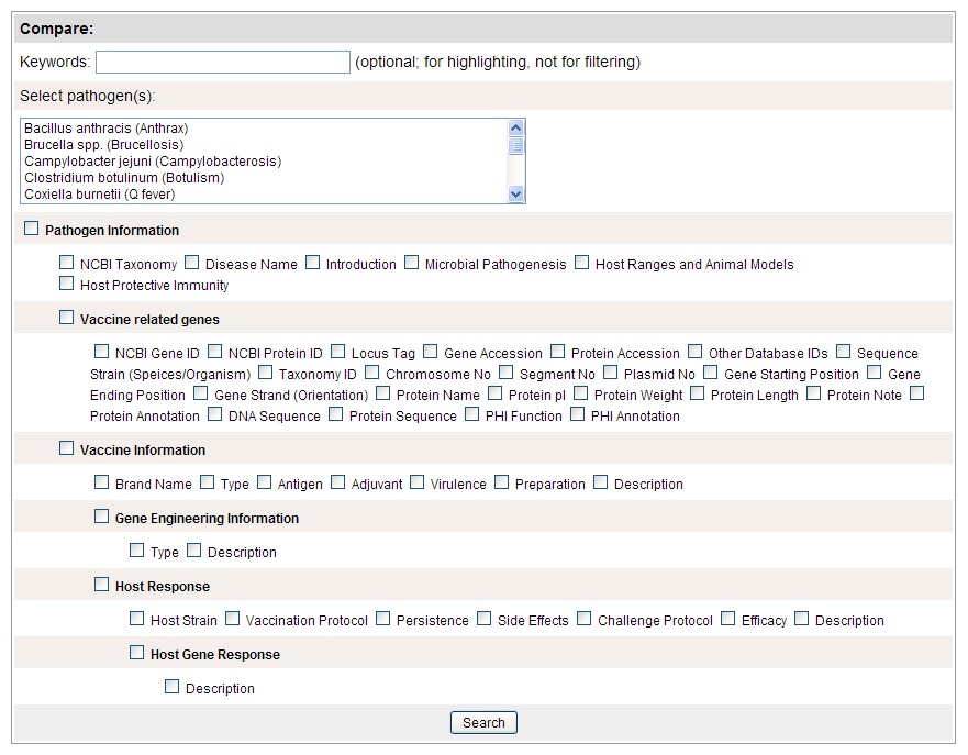 Vaxquery aslo provides advanced searching features as described below: Vaccine Search and ComparisonSearch and compare individual vaccines by selecting a pathogen name and specifying keywords.